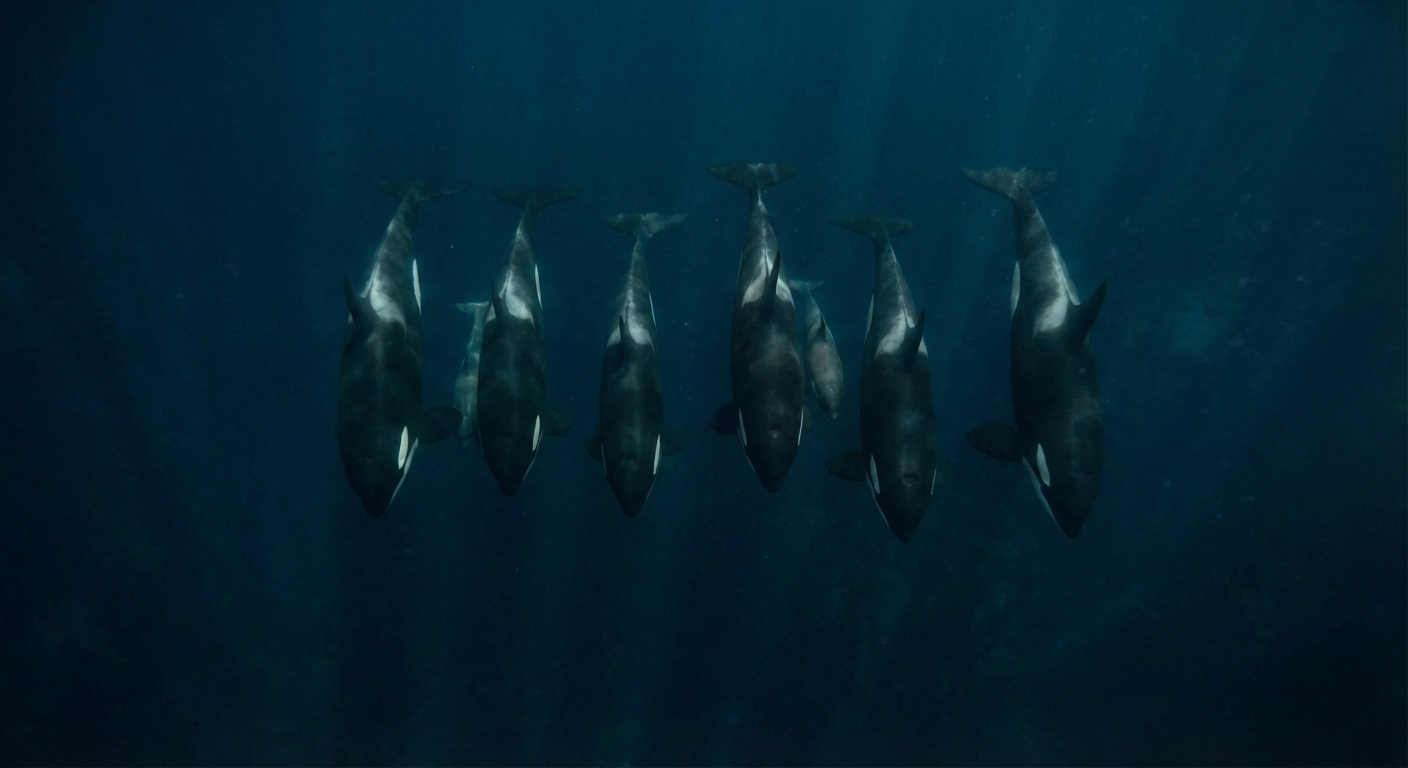 1. photo realistic, photo of 8 orcas in a parallel line swimming below, underwater.